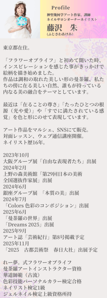 自分の手でひとつずつ円を描き、調和の取れたきれいなお花が咲いた時、自分の心もエネルギーも整うのを感じるでしょう。