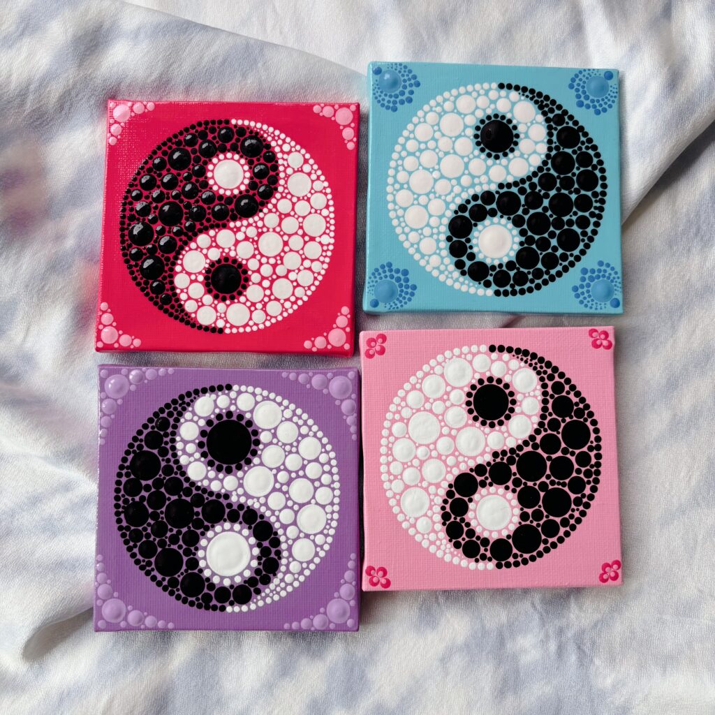 四角いミニキャンバスの太極図は白と黒の絵の具で描きます。キャンバスのベースカラーはお好きな色を選んでいただきます。